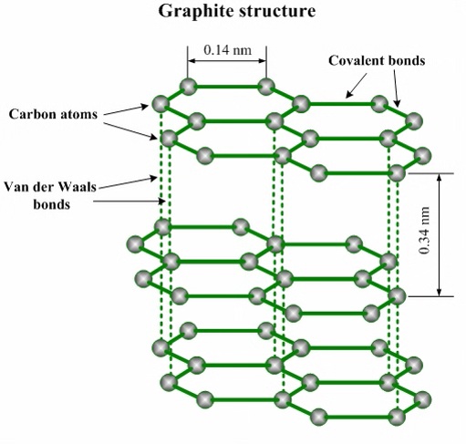 3. 有良好的导电性,在同一层内,每个碳原子未参与杂化的 p 轨道中的电子可以在整个碳原子平面中运动,形成大 π 键。有类似金属晶体的导电性