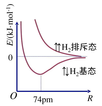 1. 当两个氢原子相互接近时,若两个氢原子核外电子的 自旋方向相反,它们接近到一定距离时,两个 1s 轨道发生重叠,电子在两原子核间出现的机会较大。随着核间距的减小,核间电子出现的机会增大,体系的能量逐渐下降,达到能量最低状态。核间距进一步减小时,两原子间的斥力使体系的能量迅速上升这种排斥作用又将氢原子推回到平衡位置。氢分子的形成过程中能量(主要指势能)随核该间距的变化如图所示