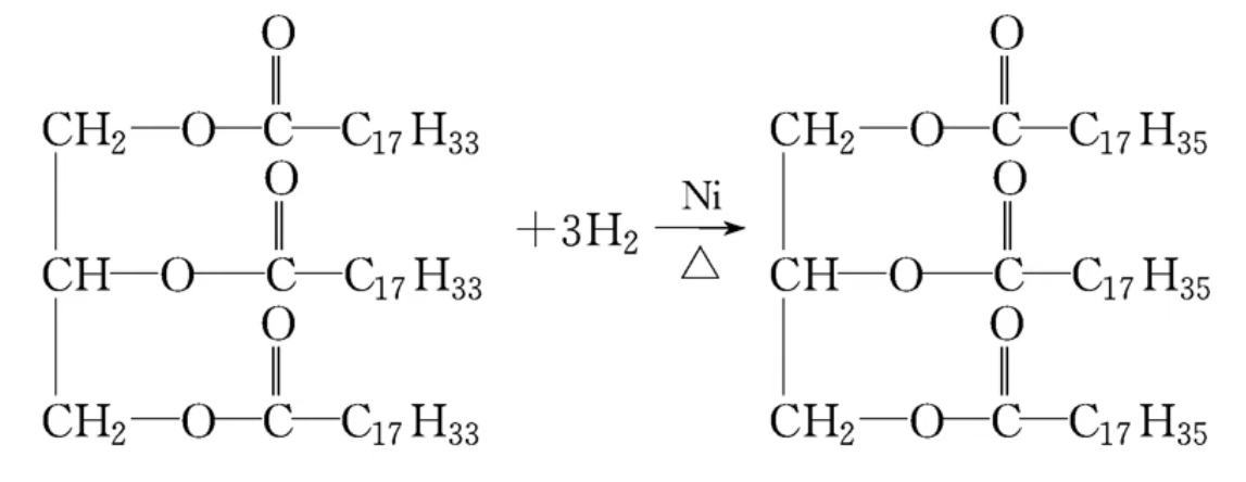 不饱和程度较高、熔点较低的液态油,通过催化加氢可提高饱和程度,转化为半固态脂肪这个过程称为油脂的氢化,也称油脂的硬化。制得的油脂叫人造脂肪,通常又称为硬化油。硬化油不易被空气氧化变质,便于储存和运输,可以制造肥皂和人造奶油的原料