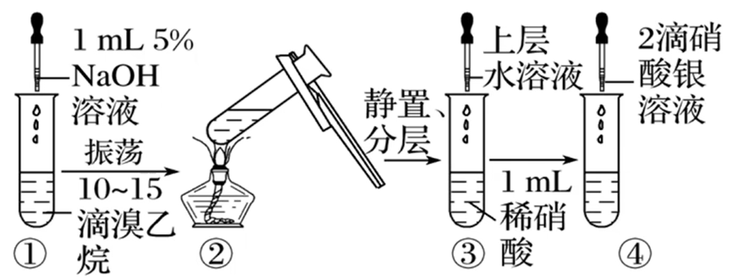 取溴乙烷,先加氢氧化钠溶液,加热,冷却后,取上层清液体,先加过量的稀硝酸酸化(中和溶液中的